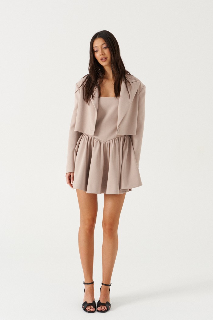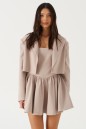 Жакет выполнен из костюмной ткани бежевого цвета. Характеристика: укороченный жакет, отложной воротник с острым лацканам, центральная застежка на петлю-пуговицу, брендированный подклад, рукав втачной, чуть спущенный, подплечники, на манжете три пуговицы. Длина рукава от края горловины 79см, длина жакета по спинке 43см.
