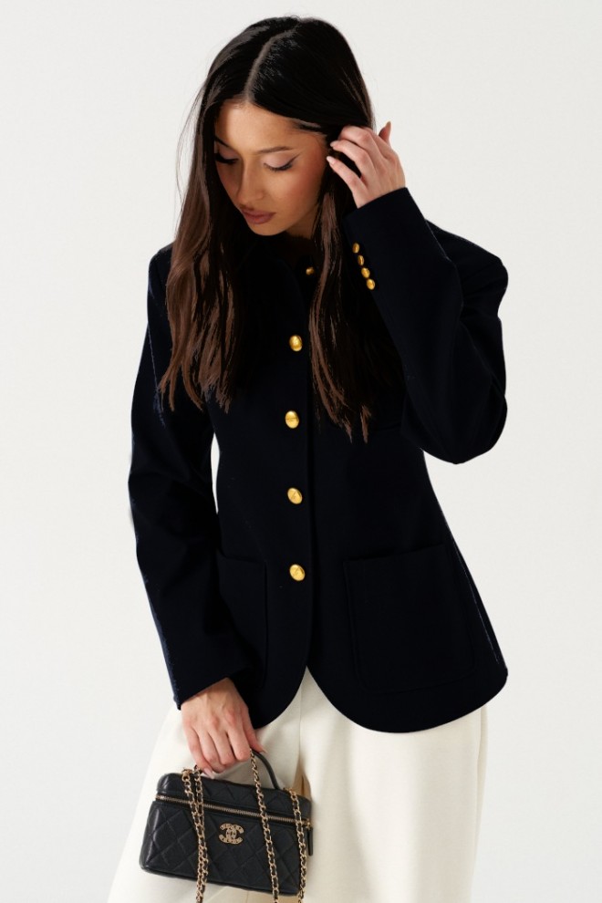 Жакет полуприталенного силуэта, выполнен из полотна черного цвета. Характеристика: слегка приталенный силуэт, воротник стойка, уентральная застежка на пуговицы, на груди слева накланой карман, чуть ниже талии по обе стороны накладные карманы, гакругленные борта, брендированный подклад, плечики, втачной рукав, по низу декоративные пуговички, спинка с центральным застроченным швом, на талии выточки. Длина рукава от шва втачивания 63см. Длина изделия по центру спинки 65см.
