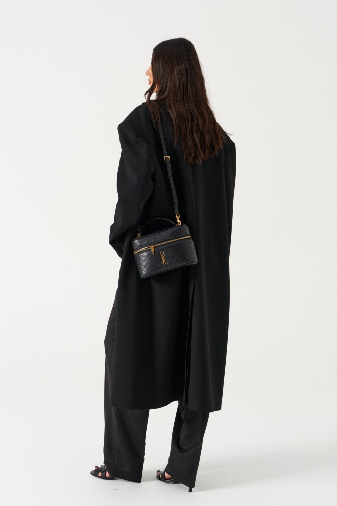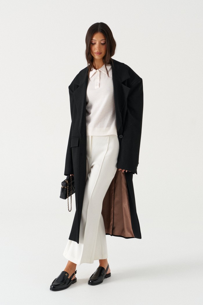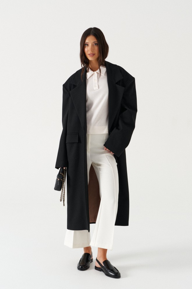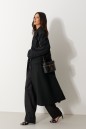 Жакет прямого свободного кроя, выполнен из костюмной ткани черного цвета. Характеристика: V-образный вырез горловины, отложной воротник, застежка центральная на две петли пуговицы, функциональные карманы с клапанами, брендированная подкладка, широкое плечо, подплечники, рукав втачной, на манжете функциональные пуговицы, в среднем шве заднего полотна изделия шлица 51 см. Длина изделия по центральному щву по спине 118 см, длина рукава от края горловины 84 см.