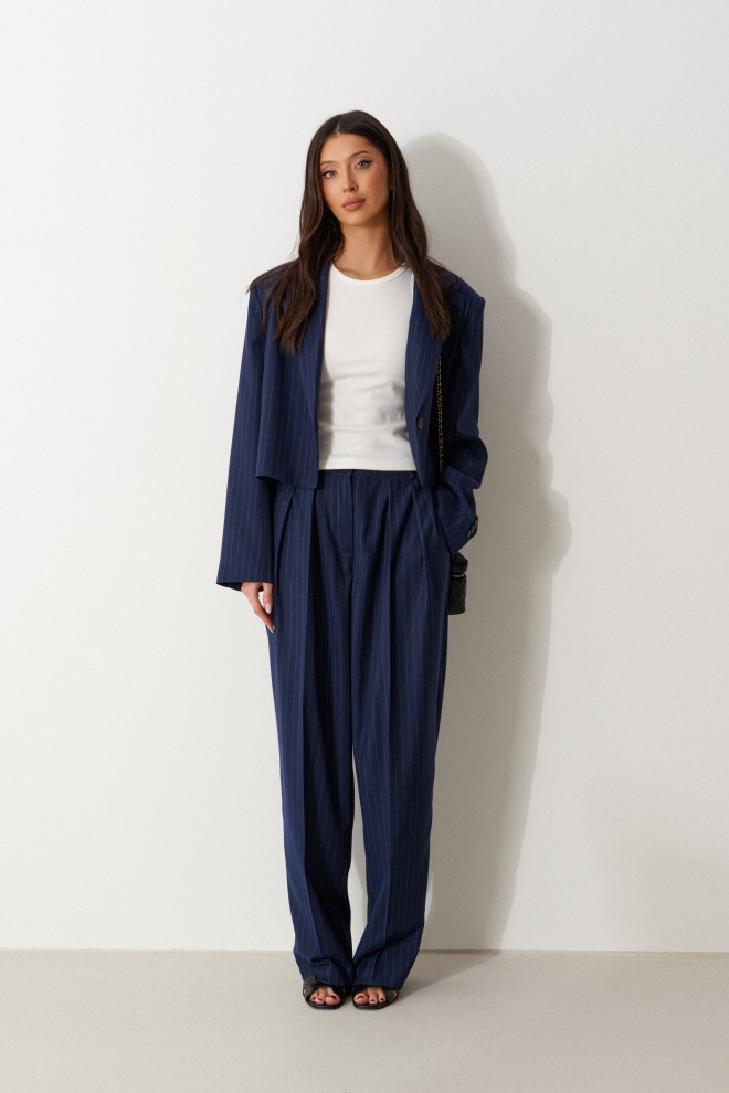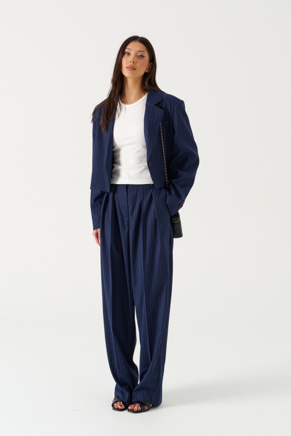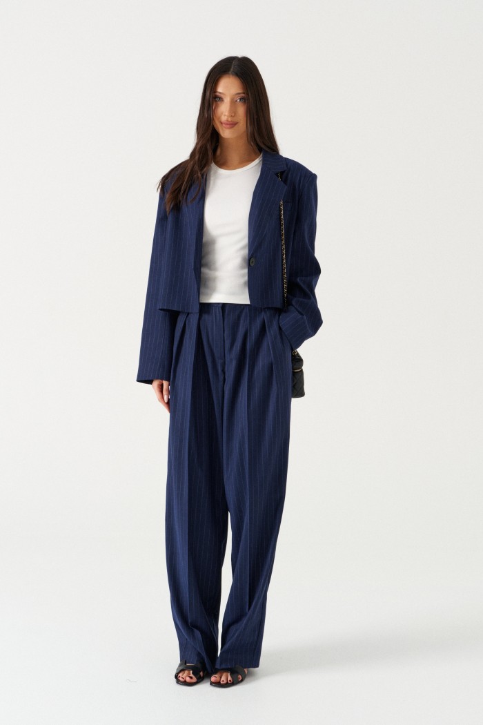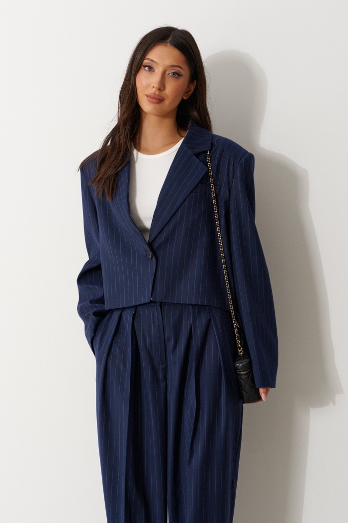 Жакет укороченный, выполнен из костюмной ткани темно-синего цвета с более светлой синей полоской. Характеристики: укороченный жакет, отложной воротник, центральная застежка на петлю-пуговицу, брендированная подкладка, рукав втачной, подплечники, на манжете четыре пуговицы. Длина рукава 62 см, длина жакета по спинке 53 см.