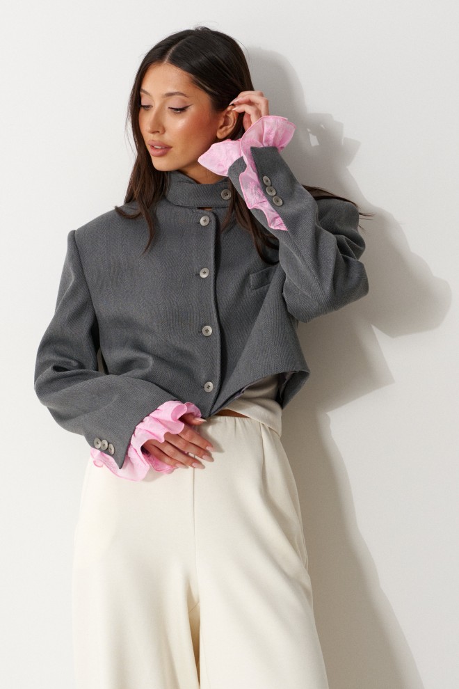 Жакет женский, прямого силуэта, укороченный, на подкладке. Выполнен из текстильной, фактурной ткани серого цвета, рисунок елочка. Характеристика: горловина стойка с хлястиком, застегивается на петлю с пуговицей. Застежка центральная бортовая, застегивающаяся на петли, пуговицы. Подплечники. Брендированная подкладка. Рукав втачной двухшовный, по низу рукава вставлена рюша из тонкой хлопковой ткани. Рюша притачная. По низу рукава нашиты пуговицы. Спинка с двумя рельефными швами. Длина жакета по спинке 43 см. Длина рукава без рюши 63 см.