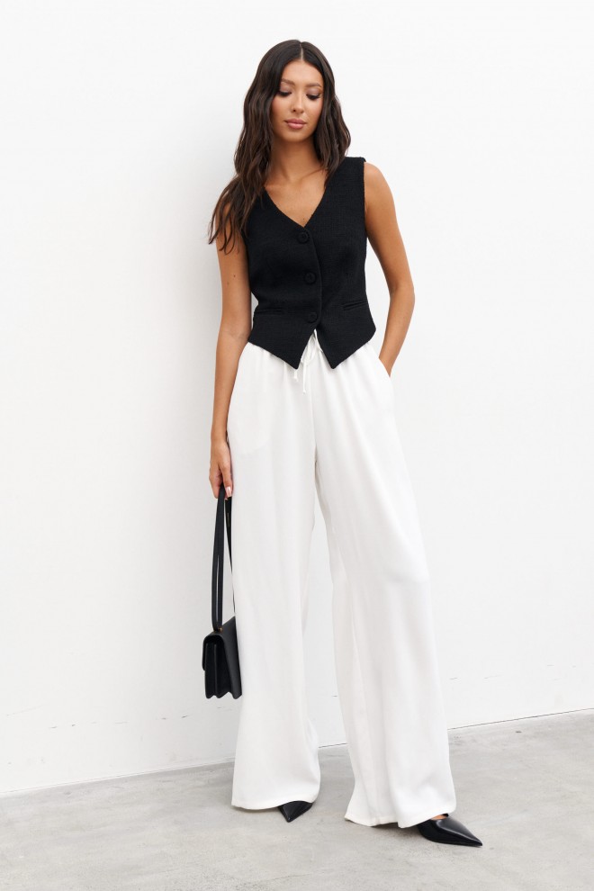 Жилет прямого кроя выполнен из фактурного полотна черного цвета.