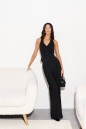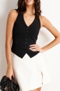 Жилет с открытыми плечами и спинкой прилегающего силуэта выполнен из ткани черного цвета.