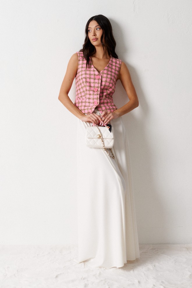 Жилет полуприлегающего силуэта выполнен из фактурного полотна розового цвета с принтом клетка.