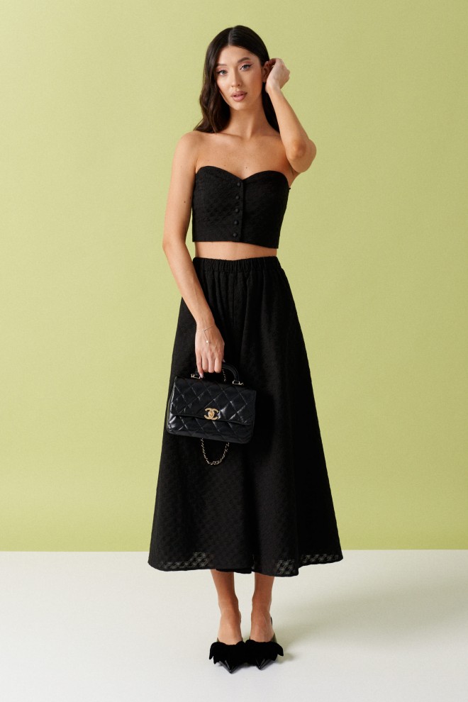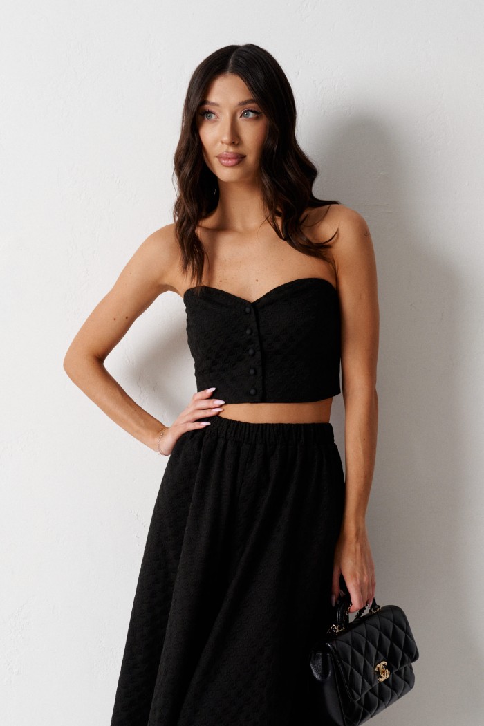 Укороченный топ выполнен из черного хлопкового полотна с вышивкой в виде сердечек.