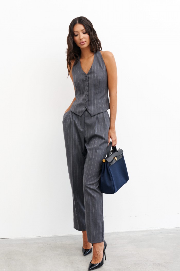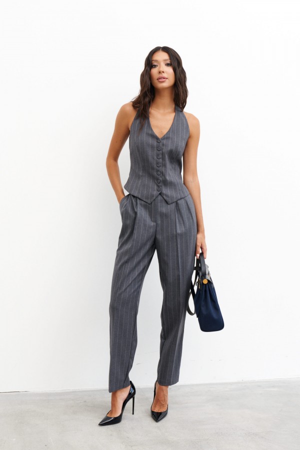 Жилет с открытой спинкой и плечами. Выполнен из костюмной ткани цвета гарфит с полоской. Прилегающий силуэт, подклад, отрезной бочок, спинка декорирована хлястиком с пуговичкой. Застёжка центральная на петли-пуговицы (декорированы тканью основного изеделия). Длина спинки жилета 24 см.