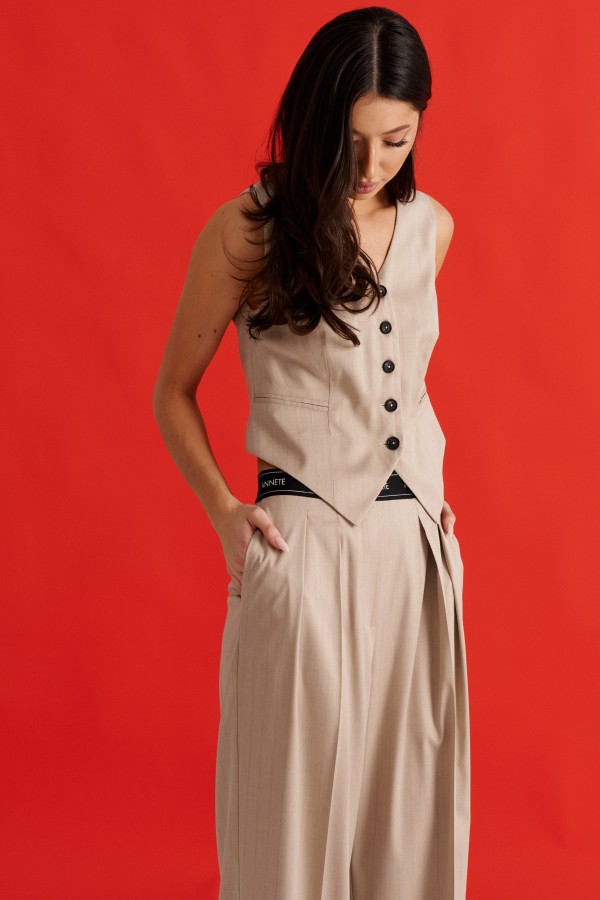 Жилет прямого кроя выполнен из ткани песочного цвета в тонкую полоску. Характеристики однобортный, прямой крой, подкладка, прорезные карманы обманки, застежка центральная на петли - пуговицы, низ изделия по переду с фигурным низом, по заднему полотну декоративная деталь. Длина по спинке от края горловины 40 см