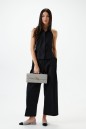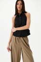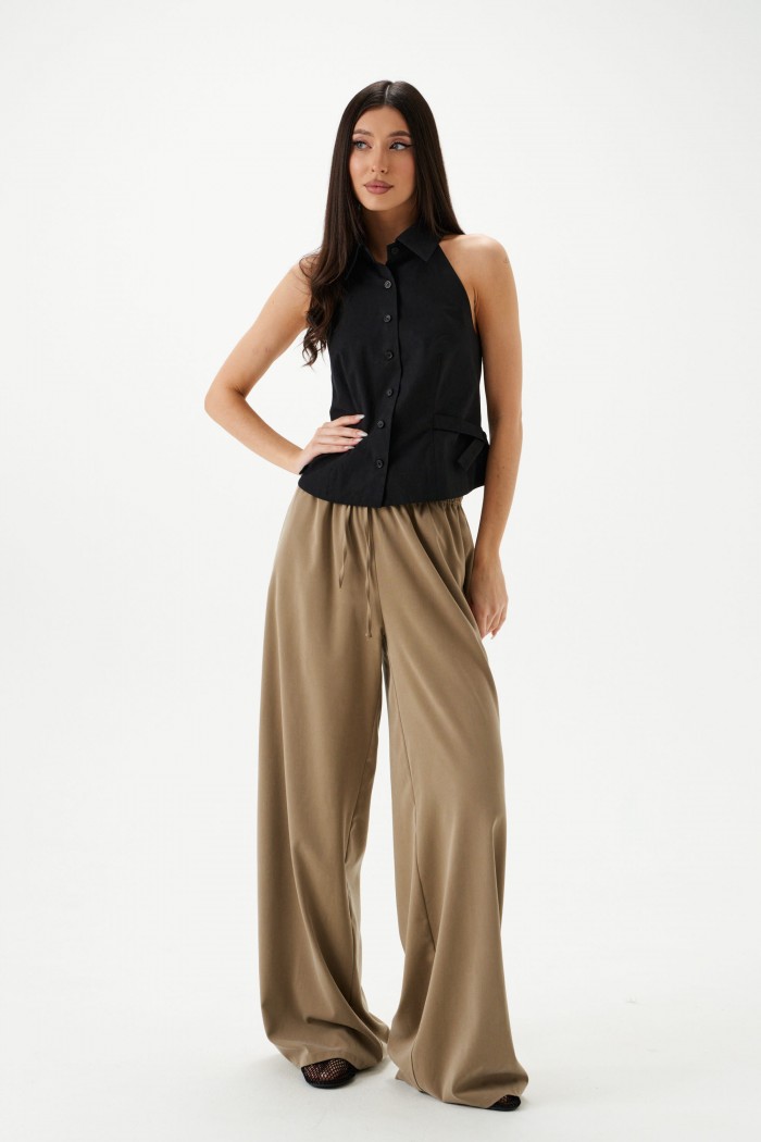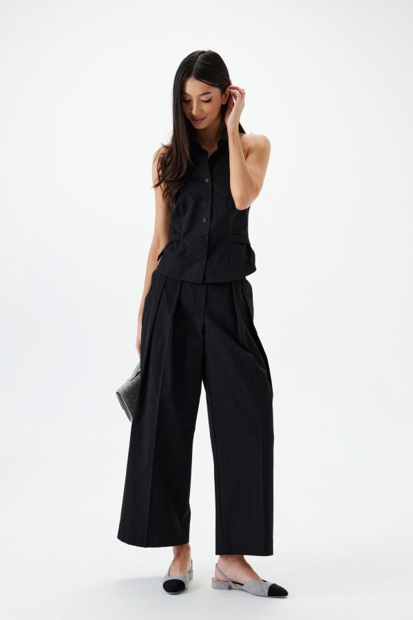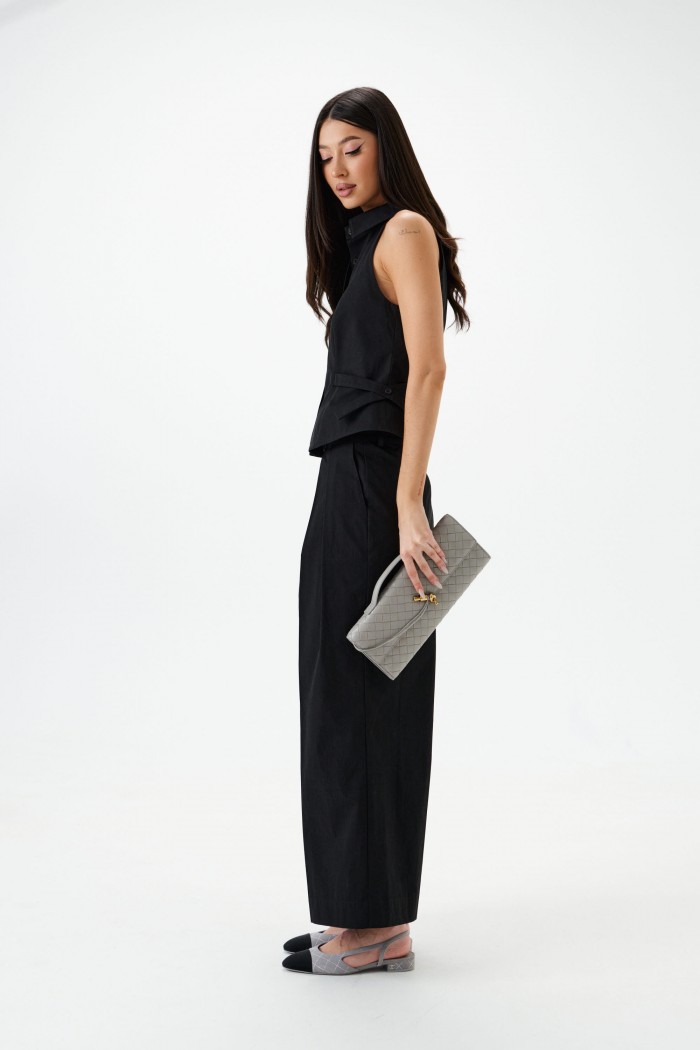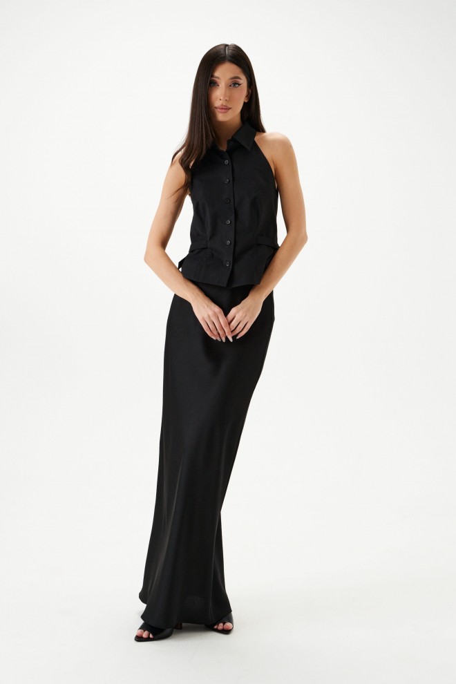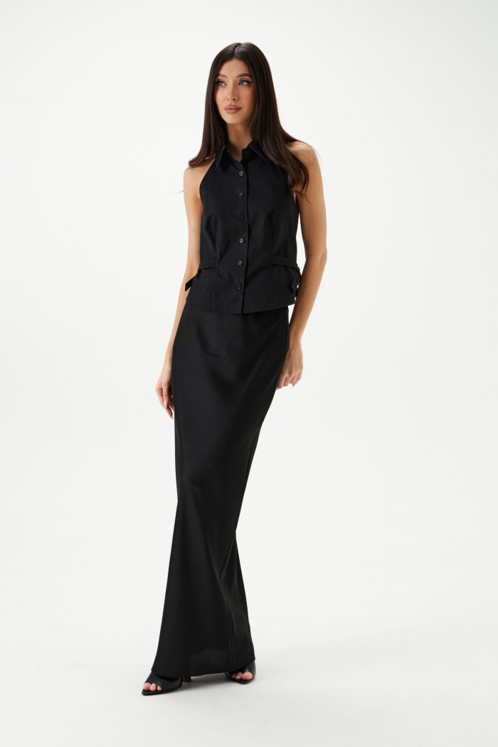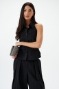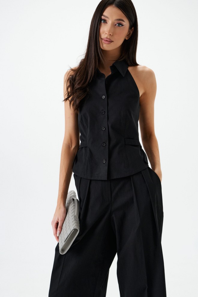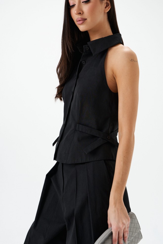 Жилет с открытыми плечами прилегающего силуэта выполнен из текстильного полотна черного цвета. Характеристики: прилегающий силуэт, подкладка, застежка центральная на петли пуговички, отложной воротник, по бокам изделия декоративные детали. Длина по спинке 49 см.