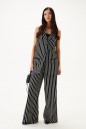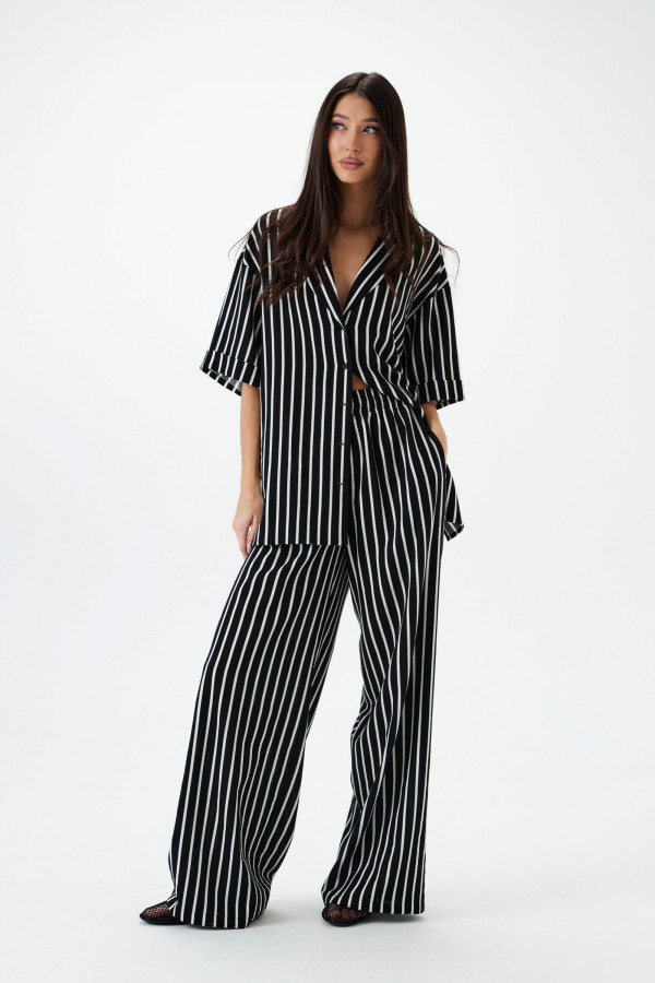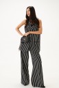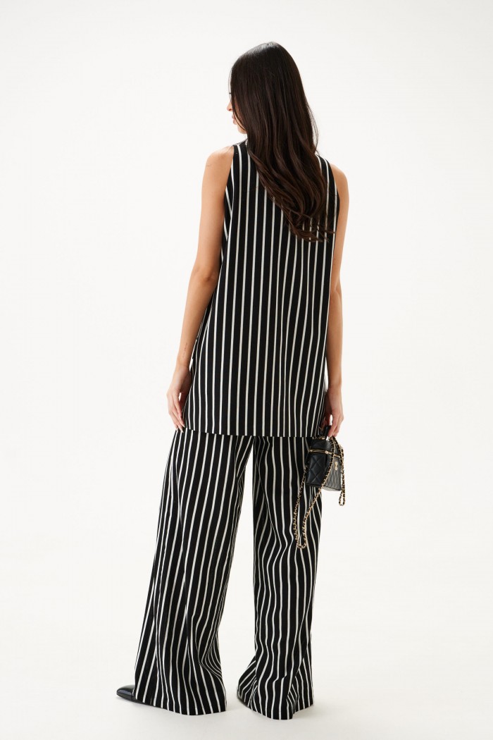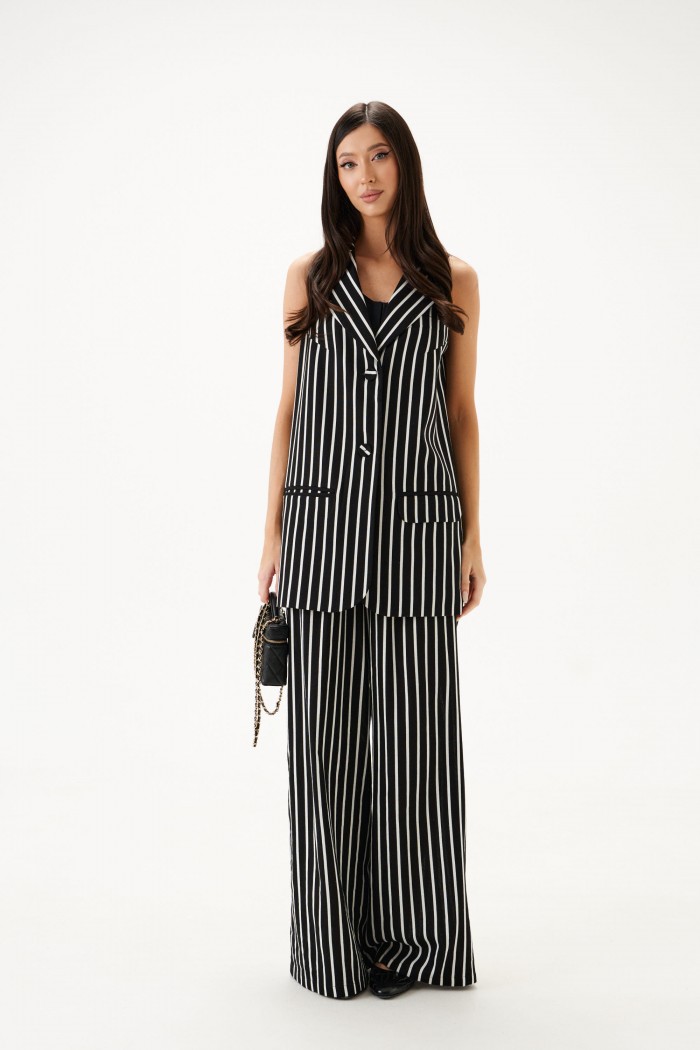 Жилет однобортный. Выполнен из текстильного полотна в белую полоску. Прямой крой, подкладка, воротник отложной с широким лацканом. По переду два функциональнных кармана. Застежка центральная на петли - пуговицы. Длина по спинке 80см.