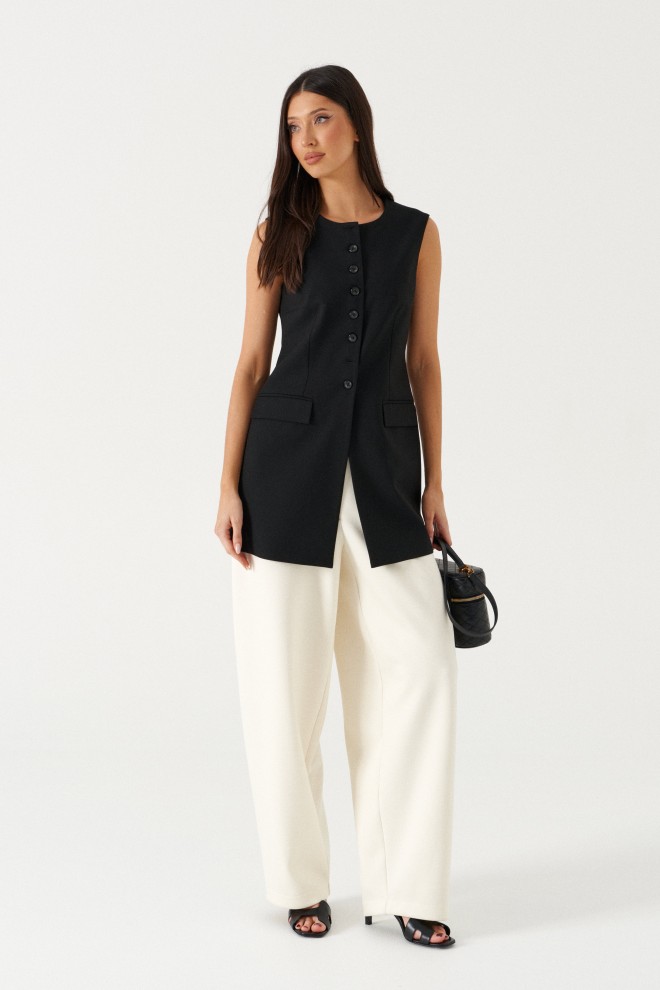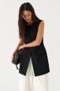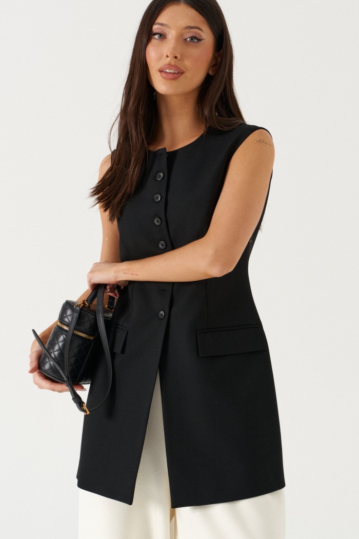 Характеристики: приталенный, овальная горловины, подкладка, застежка центральная на петли-пуговицы, без рукавов, по переду прорезные функциональные карманы.