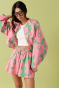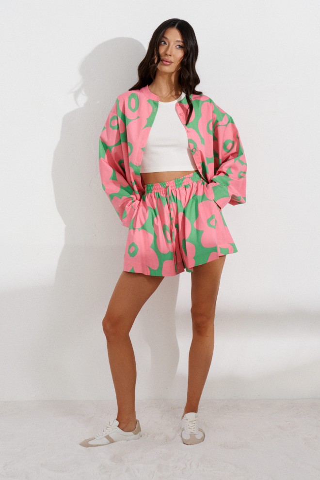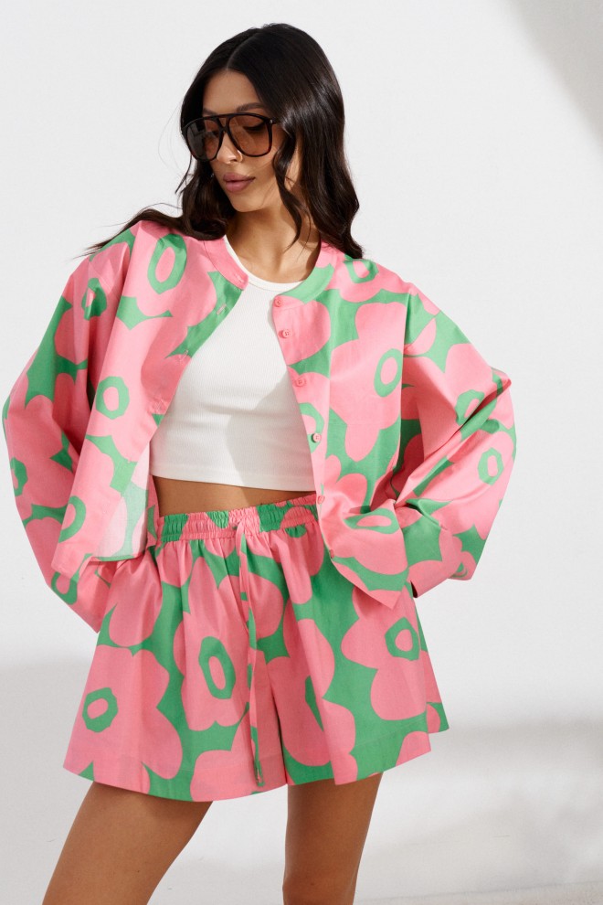 Комплект состоит из рубашки и шорт выполнен из хлопкового полотна с цветочным абстрактным принтом.