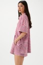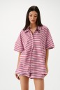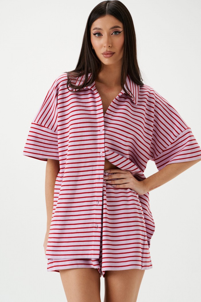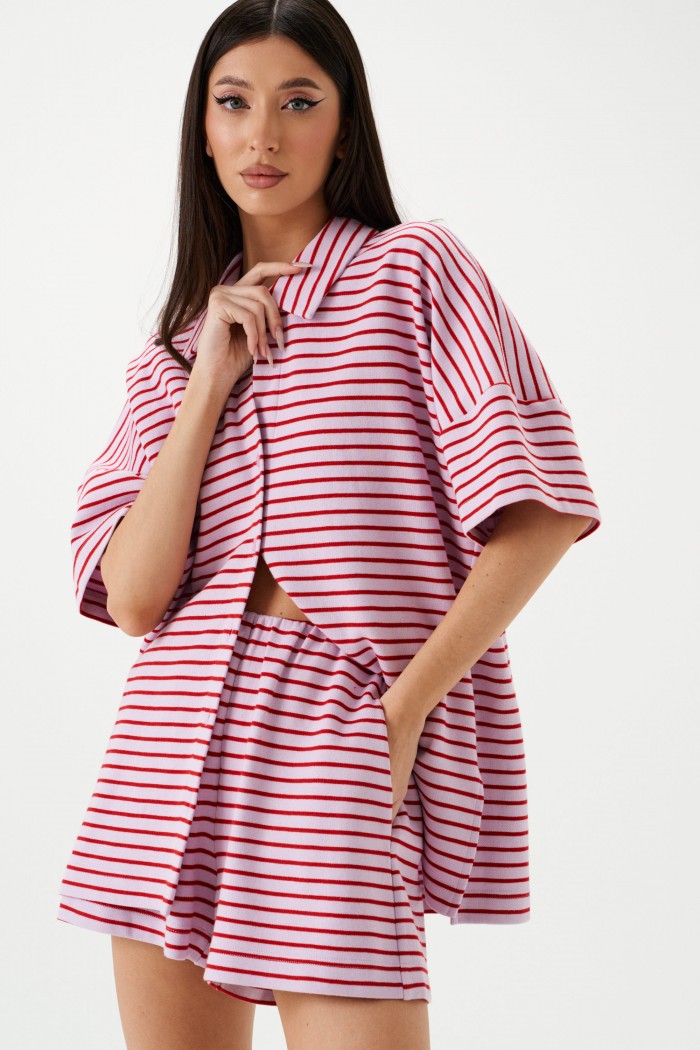 Комплект двухпредметный, состоящий из шорт и рубашки, выполнен из трикотажного полотна розового цвета в красную полоску. Характеристики: шорты полуприталенного силуэта, пояс на резинке, в боковых швах карманы, рубашка свободного кроя, застежка центральная на петли пуговицы, отложной волотник, рукав спущен. Длина шорт по боковому шву 38см, длина рубашки по спинке 71см, длина рукава 13см.