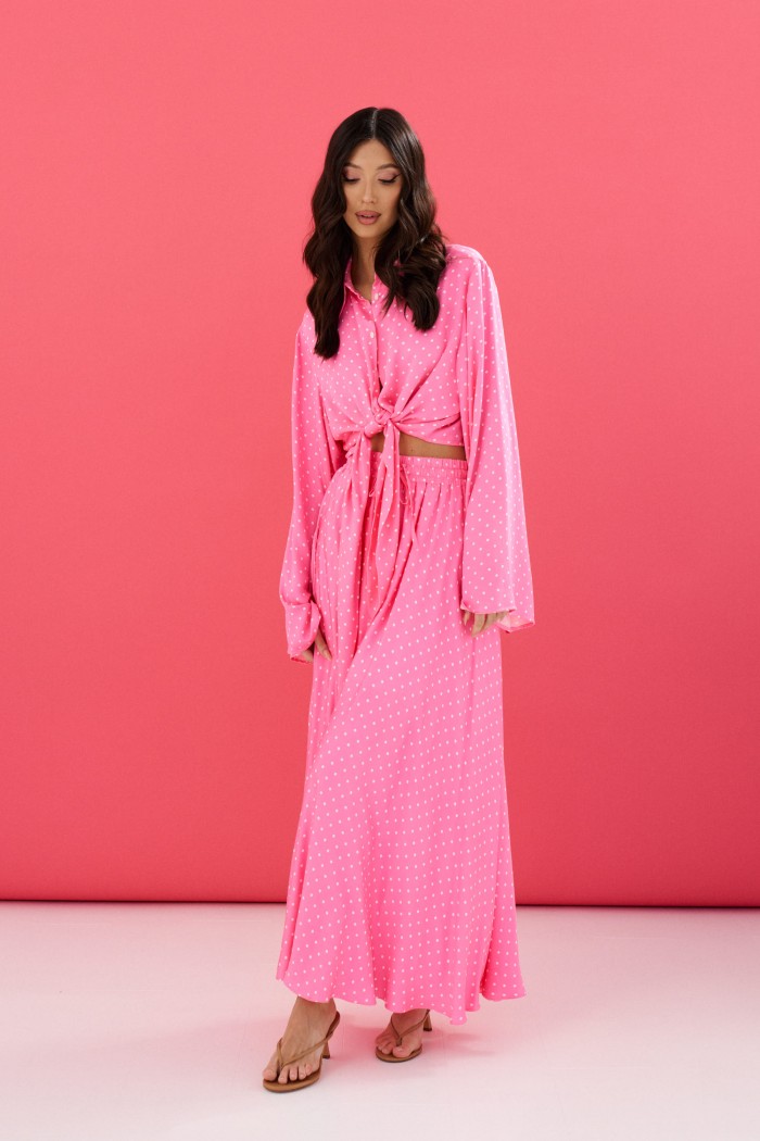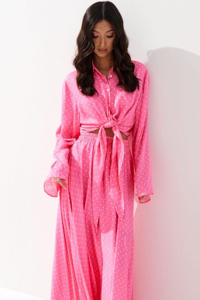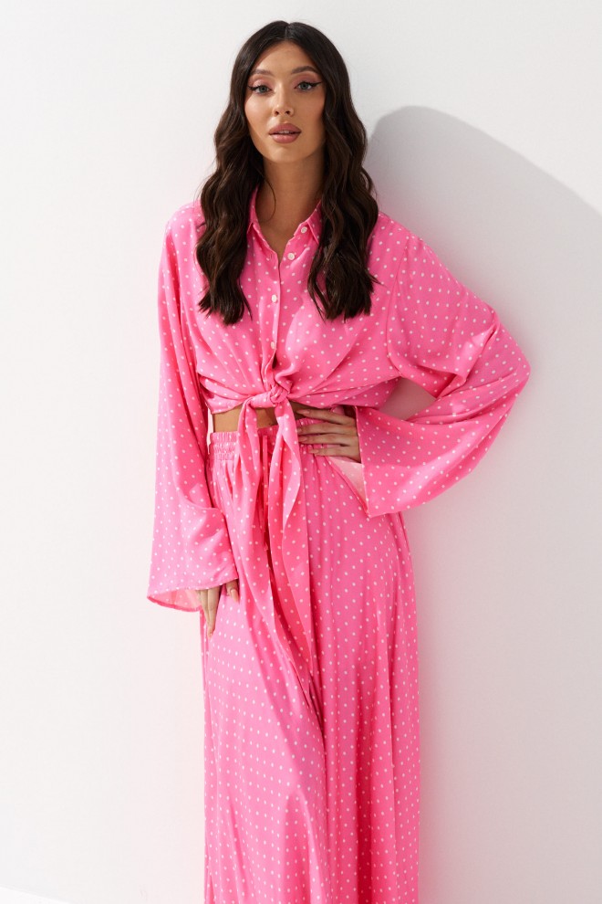 Комплект состоит из рубашки и юбки выполнен из ткани розового цвета с принтом белый горох.