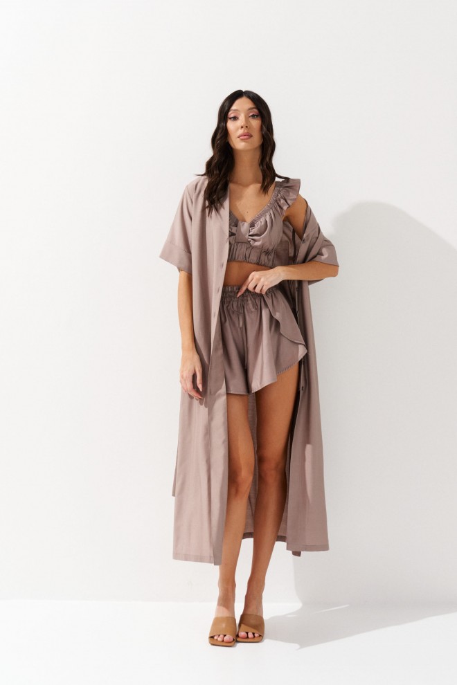 Комплект состоит из кардигана и шорт выполнен из струящейся ткани.