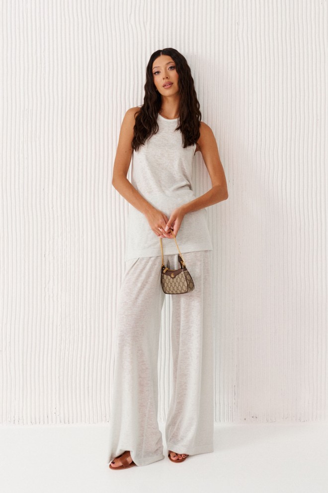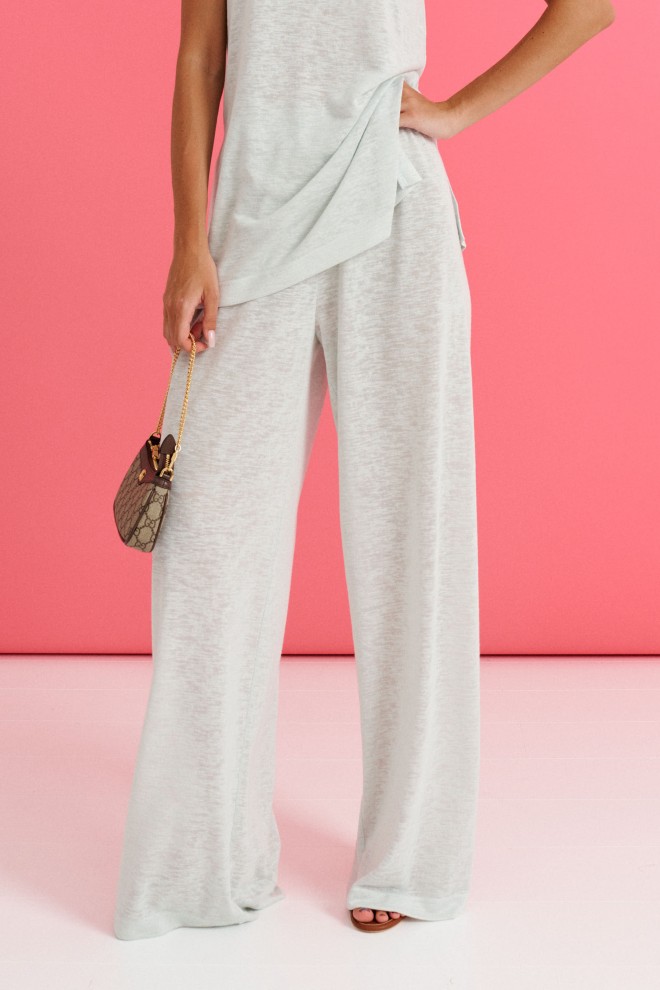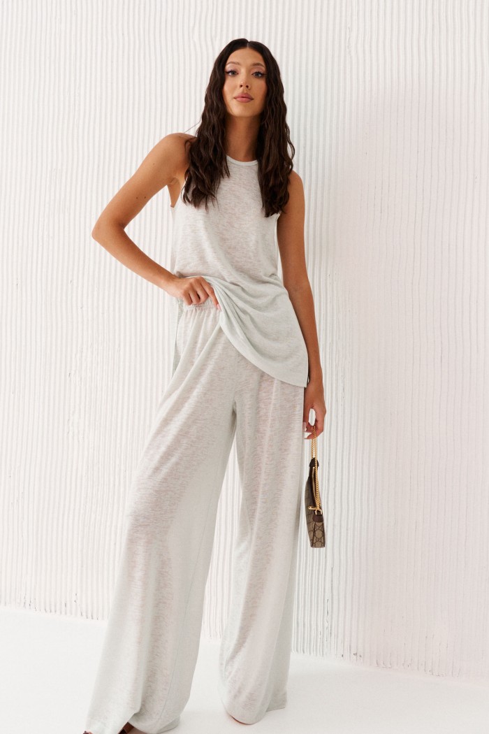 Комплект состоит из туники и брюк выполнен из полупрозрачного трикотажного полотна мятного цвета.
