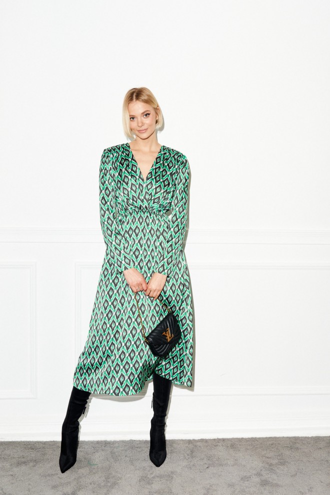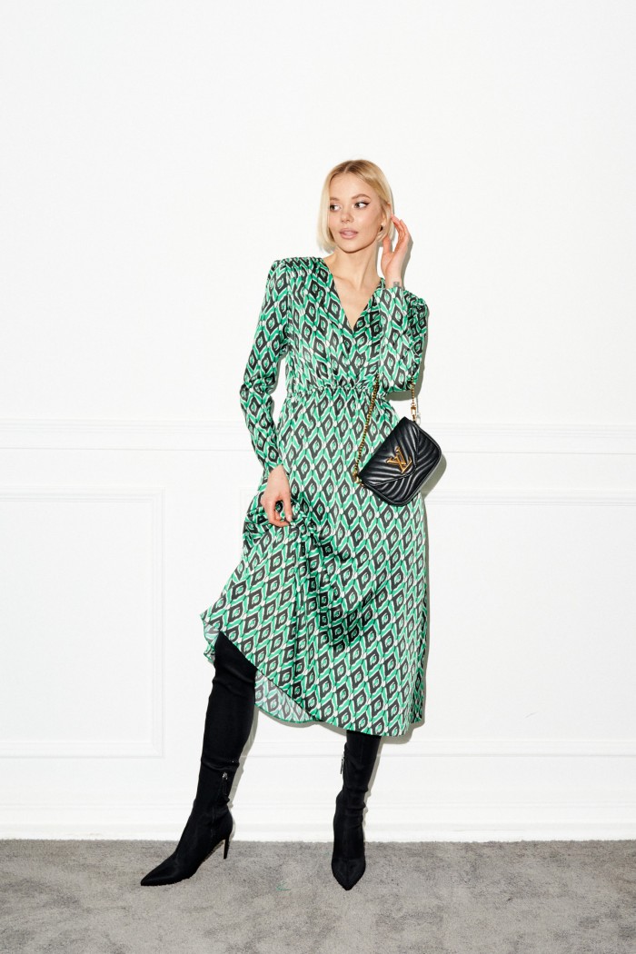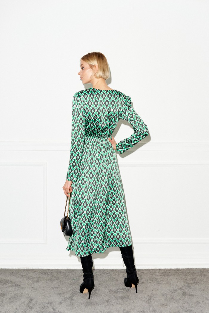 Элегантное платье полуприлегающего силуэта выполнено из полотна с контрастным ярким принтом. Утонченный женственный образ для