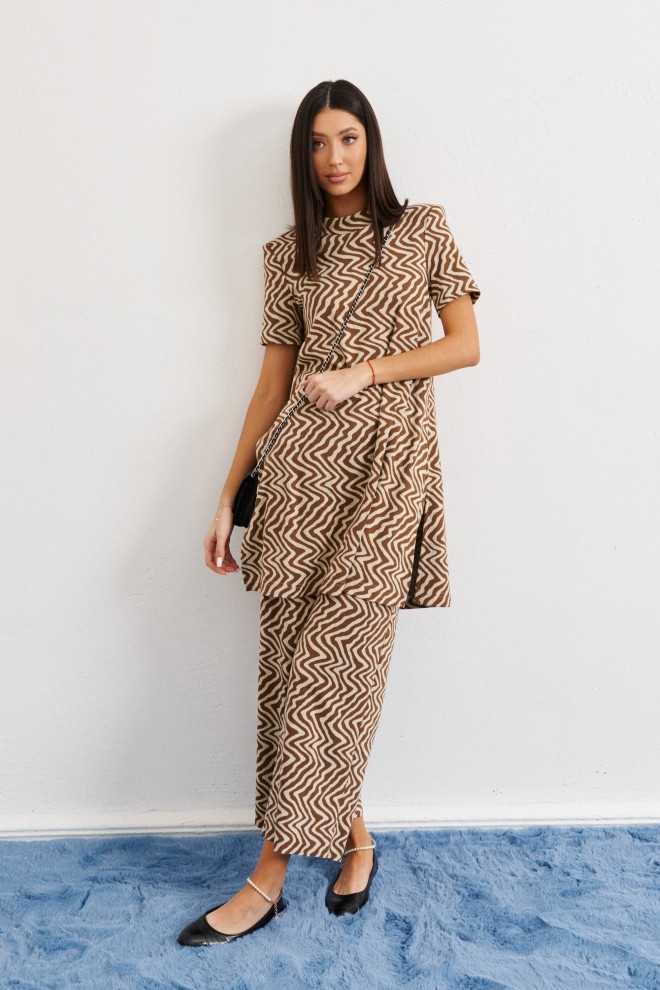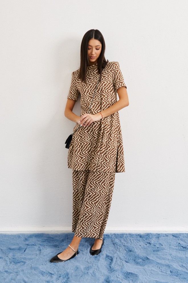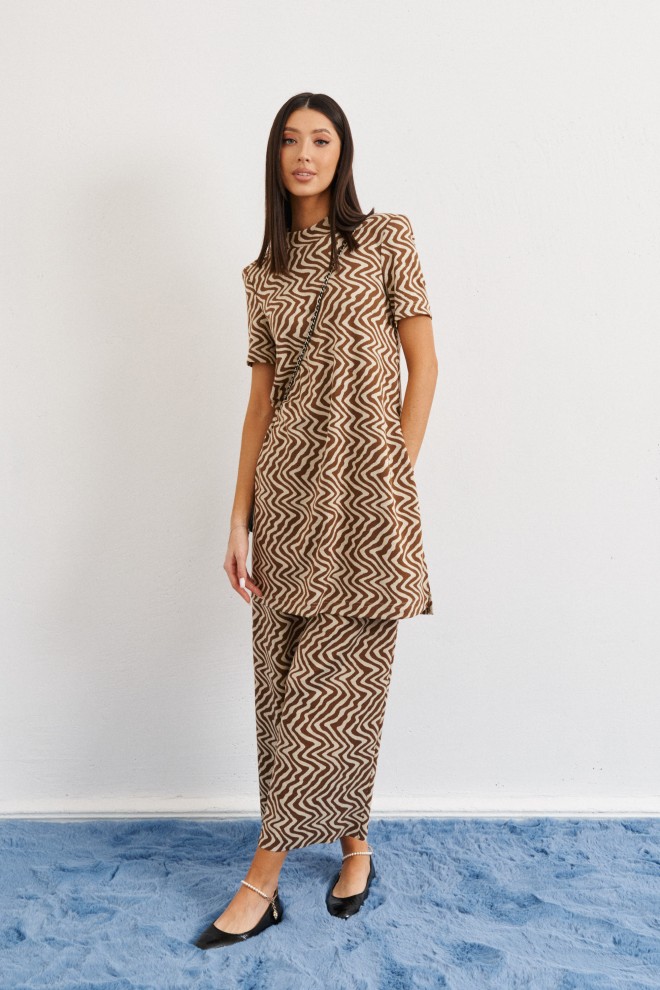 Комфортный комплект состоит из удлиненного джемпера и кюлот выполнен из трикотажного полотна с абстрактным принтом.