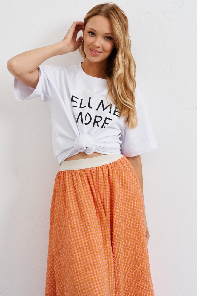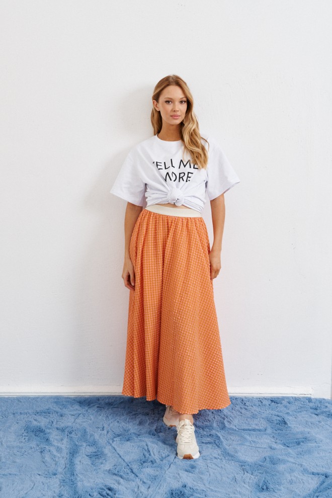 Юбка А образного силуэта длины миди, выполнена из фактурного полотна. Яркая деталь образа, подчеркнет Вашу индивидуальность.