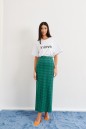 Характеристики: прямой крой, пояс стабильный, застежка - молния в среднем шве заднего полотна изделия, по заднему полотну в центральном шве разрез 56. Длина юбки 98 см.