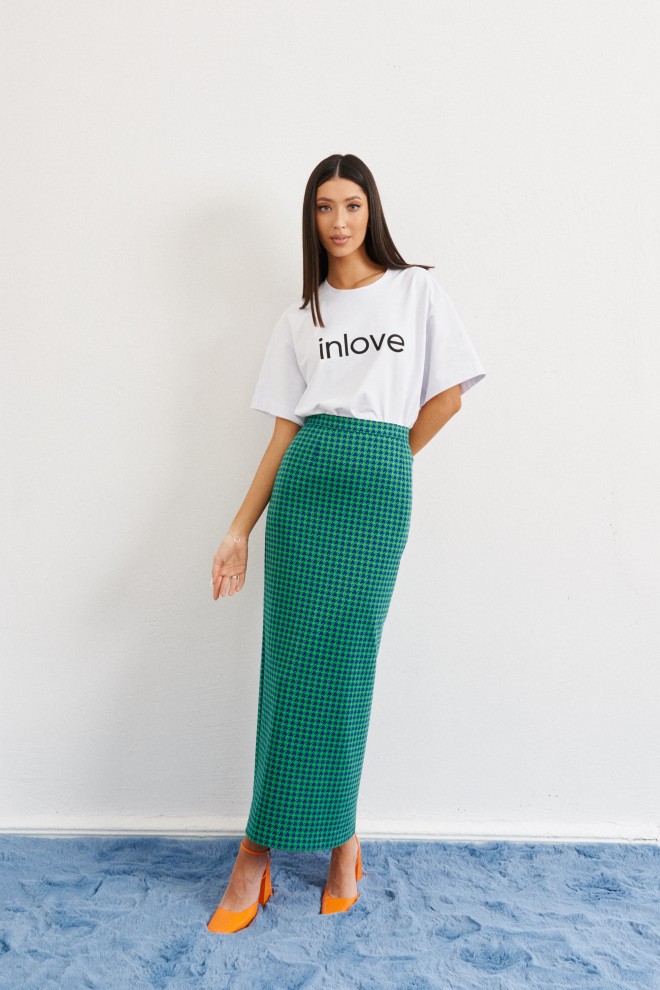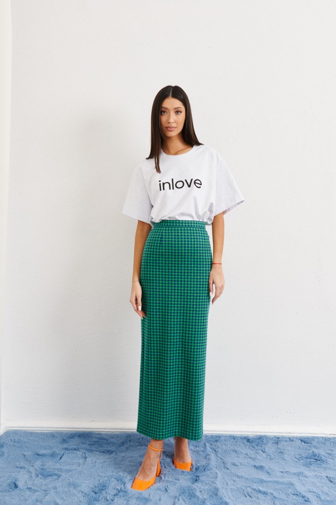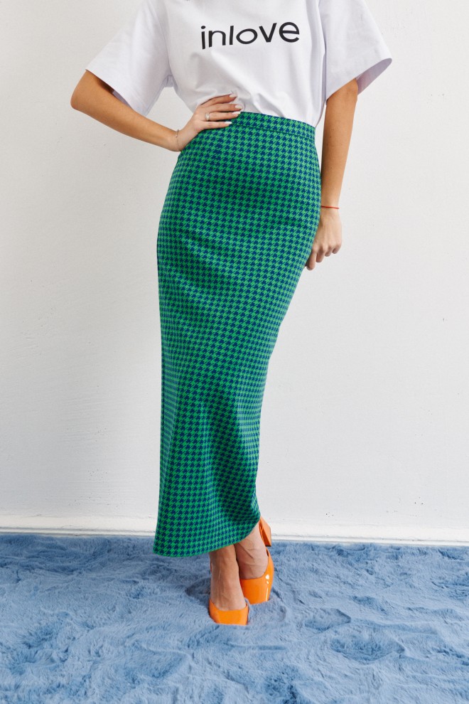 Юбка прилегающего силуэта выполнена из трикотажного полотна с абстрактным принтом. Образ дополнит жакет А5119 из действующей части коллекции.