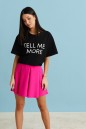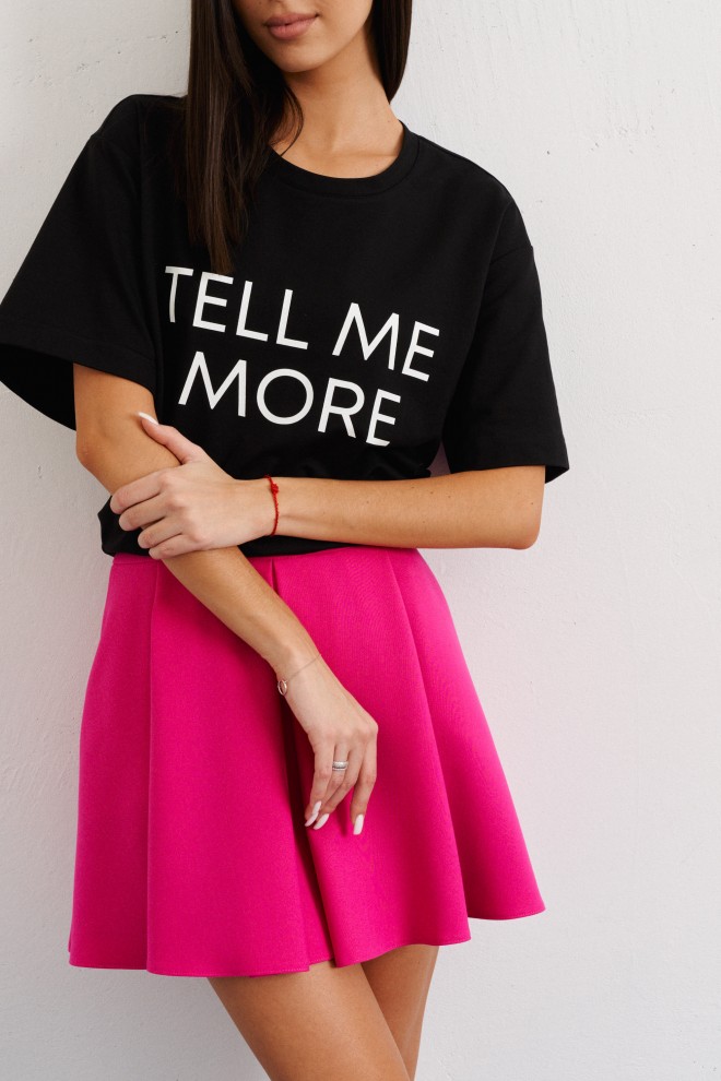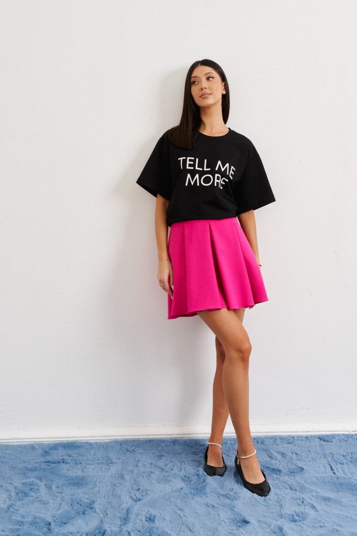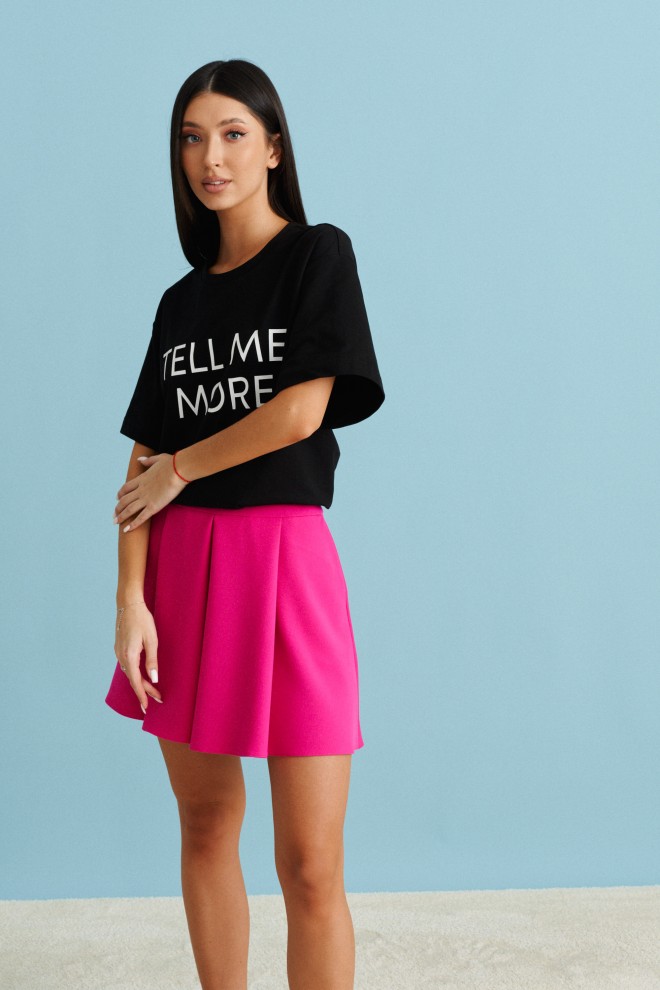 Миниатюрная юбка полуприлегающего силуэта выполнена из насыщенного розового полотна.