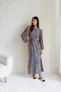 Характеристики: полуприлегающий силуэт, горловина овальная, рукав втачной свободного кроя, по низу рукава резинка, по переднему и заднему полотну симметричные крупные разрезы на резинке, по переду изделия с внутренней стороны предусмотрены декоративные завязки, застежка петля пуговичка по заднему полотну изделия. Длина по спинке 143 см, длина рукава 63 см.