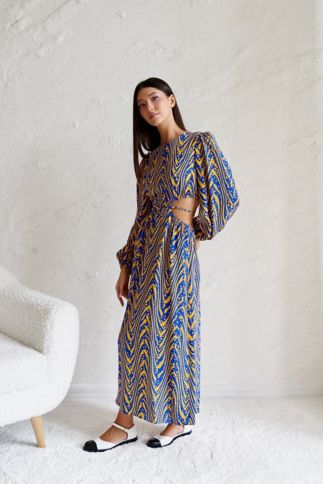 Яркое платье с акцентами декоративными вырезами выполнено из полотна с контрастным принтом.